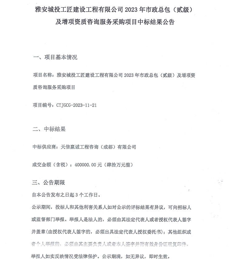 雅安城投工匠建設(shè)工程有限公司2023年市政總包(貳級)及增項資質(zhì)咨詢服務(wù)采購項目中標(biāo)結(jié)果公告