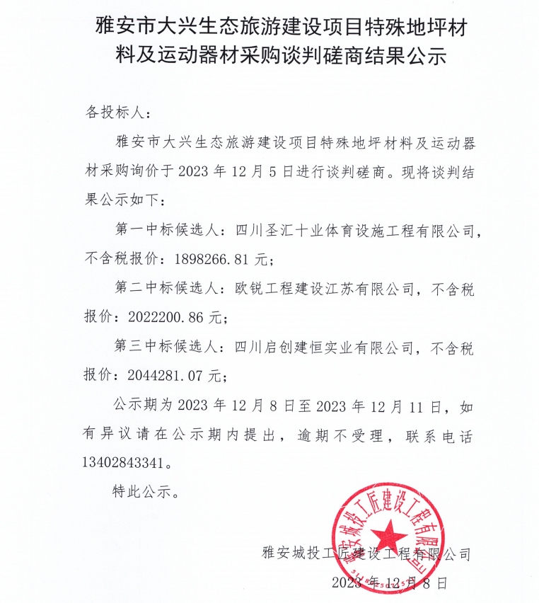 雅安市大興生態(tài)旅游建設(shè)項(xiàng)目特殊地坪材料及運(yùn)動(dòng)器材采購談判磋商結(jié)果公示