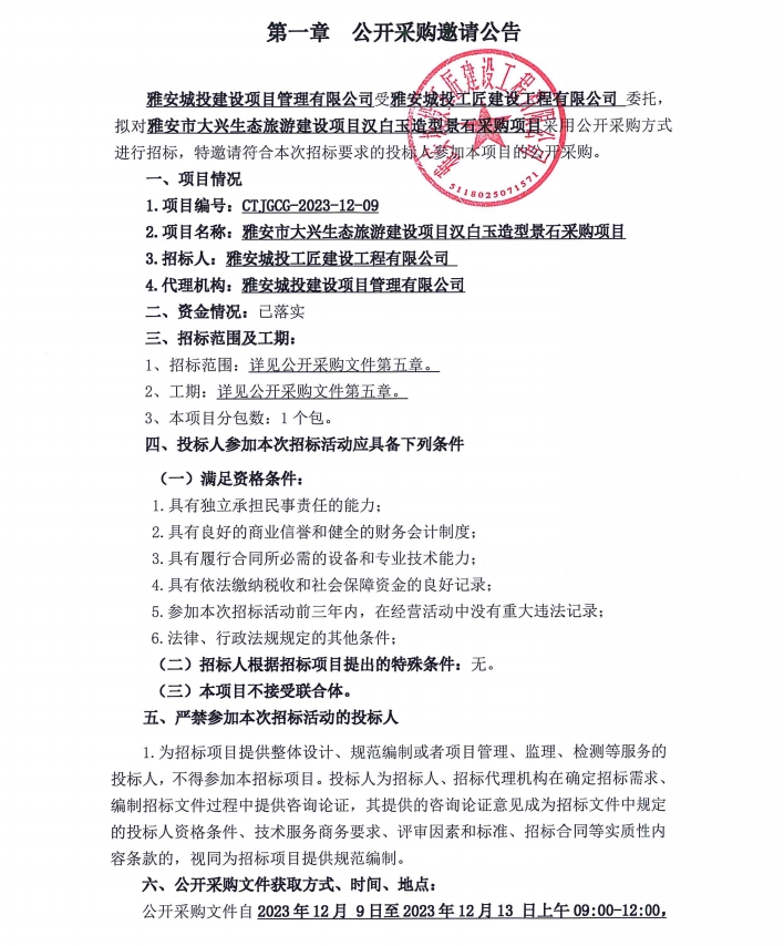 雅安市大興生態(tài)旅游建設(shè)項(xiàng)目漢白玉造型景石采購(gòu)項(xiàng)目公開(kāi)采購(gòu)邀請(qǐng)公告