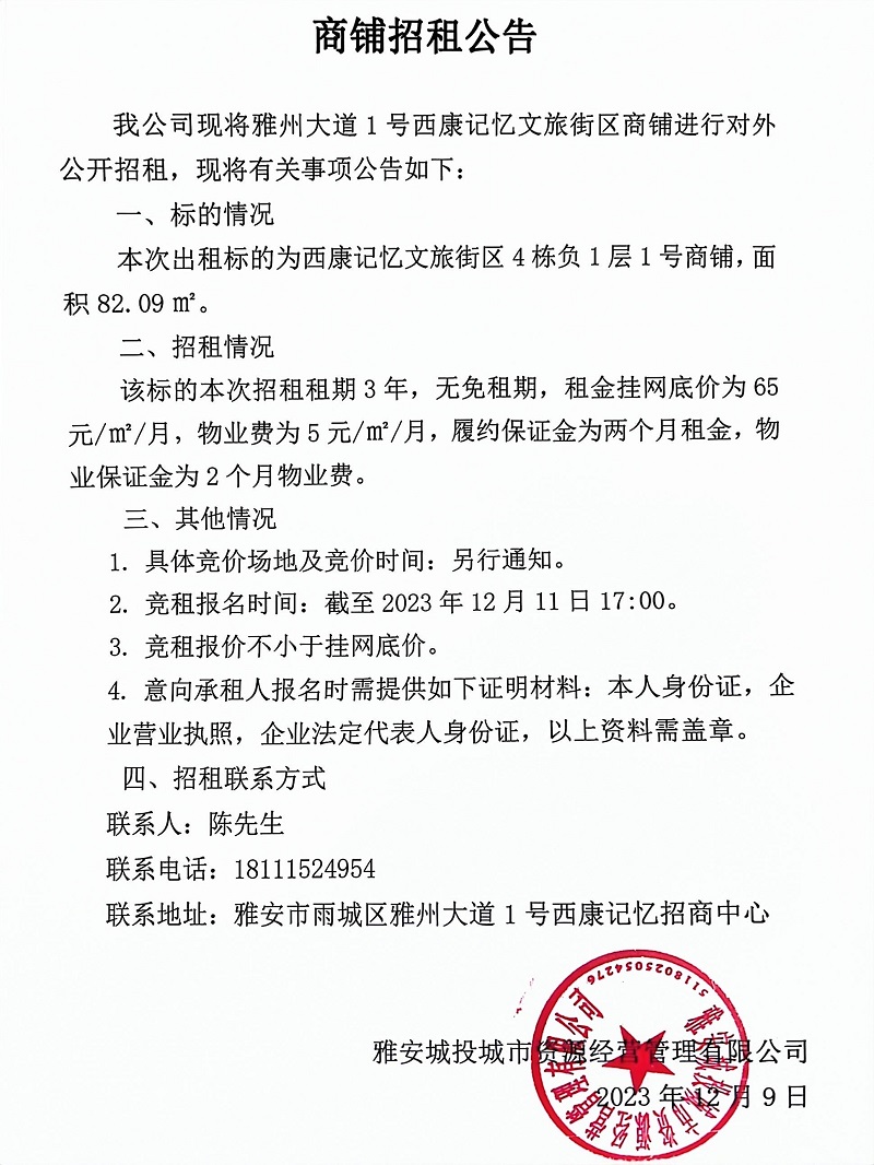 雅州大道1號西康記憶文旅街區(qū)4棟負(fù)1層1號商鋪招租公告