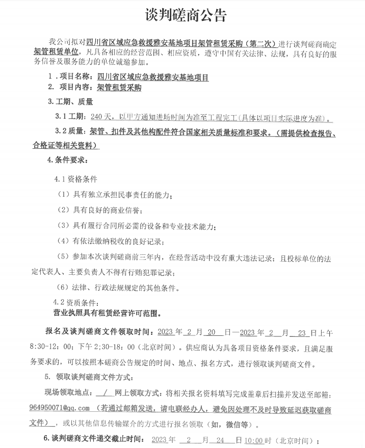 四川省區(qū)域應(yīng)急救援雅安基地項目架管租賃采購(第二次)談判磋商公告