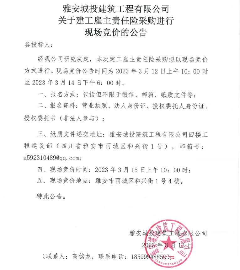 雅安城投建筑工程有限公司關(guān)于建工雇主責(zé)任險采購進行現(xiàn)場競價的公告