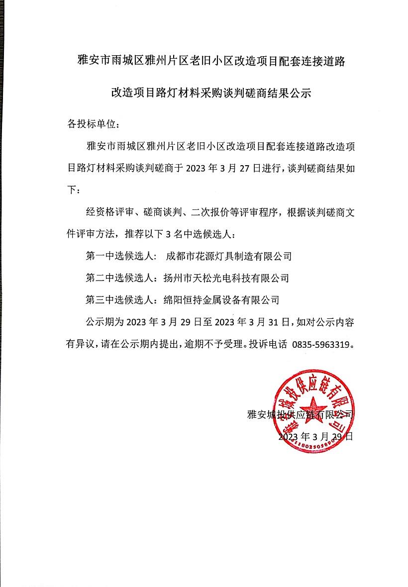 雅安市雨城區(qū)雅州片區(qū)老舊小區(qū)改造項(xiàng)目配套連接道路改造項(xiàng)目路燈材料采購談判磋商結(jié)果公示