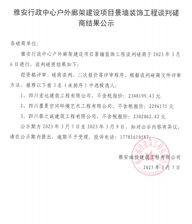 雅安行政中心戶外廊架建設(shè)項目景墻裝飾工程談判磋商結(jié)果公示
