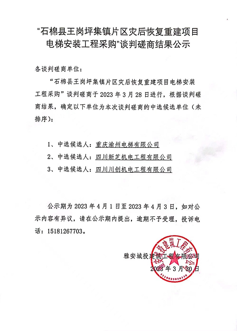 “石棉縣王崗坪集鎮(zhèn)片區(qū)災(zāi)后恢復(fù)重建項(xiàng)目電梯安裝工程采購”談判磋商結(jié)果公示