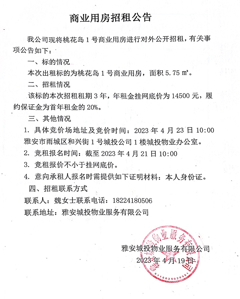 桃花島1號(hào)商業(yè)用房招租公告