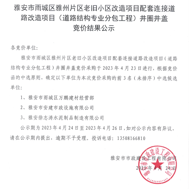 雅安市雨城區(qū)雅州片區(qū)老舊小區(qū)改造項(xiàng)目配套連接道路改造項(xiàng)目(道路結(jié)構(gòu)專業(yè)分包工程)井圈井蓋競價結(jié)果公示