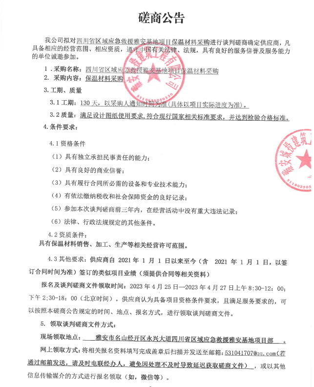 四川省區(qū)域應(yīng)急救援雅安基地項(xiàng)目保溫材料采購(gòu)談判磋商公告