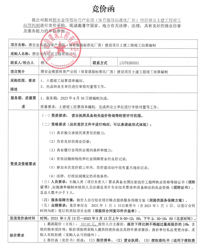 雅安金熊貓?bào)w育產(chǎn)業(yè)園(體育服裝標(biāo)準(zhǔn)化廠房)建設(shè)項(xiàng)目土建工程竣工結(jié)算編制競價(jià)公告