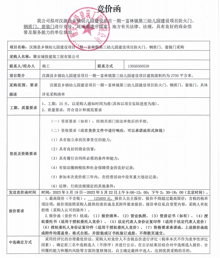 漢源縣鄉(xiāng)鎮(zhèn)幼兒園建設(shè)項(xiàng)目一期一富林鎮(zhèn)第三幼兒園建設(shè)項(xiàng)目防火門(mén)、鋼質(zhì)門(mén)、套裝門(mén)采購(gòu)競(jìng)價(jià)公告