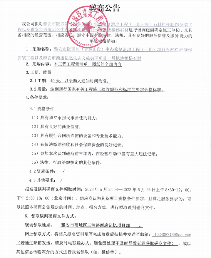 雅安市隴西河(青鼻山段)生態(tài)修復(fù)治理工程(一期)項(xiàng)目石材欄桿制作安裝工程以及雅安市西康記憶生態(tài)文旅街區(qū)項(xiàng)目一號(hào)地塊樓梯石材談判磋商公告