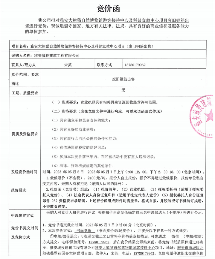 雅安大熊貓自然博物館游客接待中心及科普宣教中心項(xiàng)目廢舊鋼筋出售競(jìng)價(jià)公告