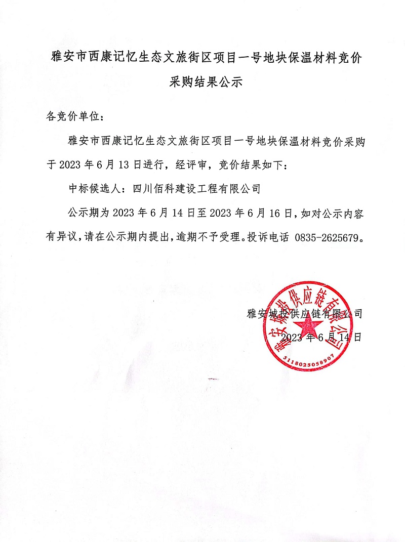 雅安市西康記憶生態(tài)文旅街區(qū)項(xiàng)目一號(hào)地塊保溫材料采購(gòu)競(jìng)價(jià)采購(gòu)結(jié)果公示