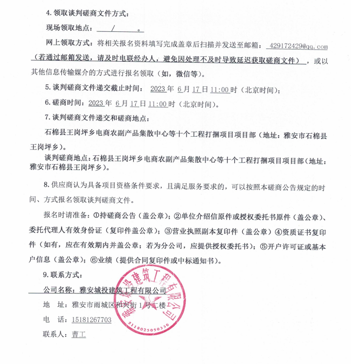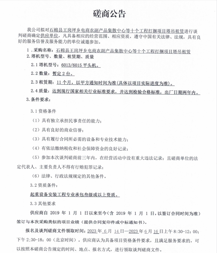 石棉縣王崗坪鄉(xiāng)電商農(nóng)副產(chǎn)品集散中心等十個(gè)工程打捆項(xiàng)目塔吊租賃談判磋商公告