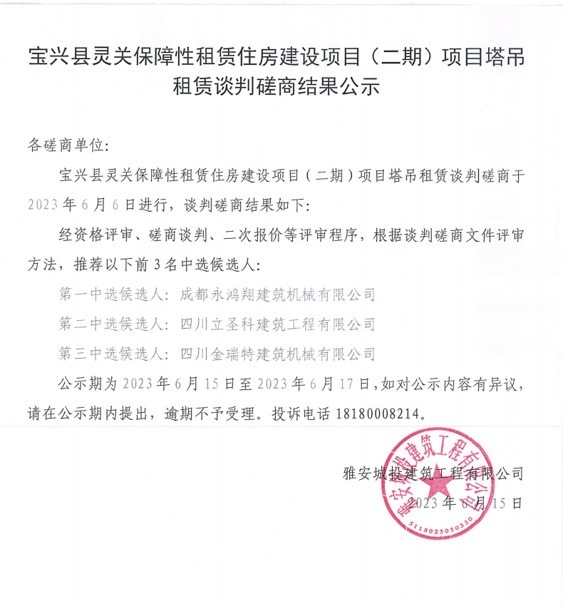 寶興縣靈關(guān)保障性租賃住房建設(shè)項(xiàng)目(二期)項(xiàng)目塔吊租賃談判磋商競(jìng)價(jià)結(jié)果公示