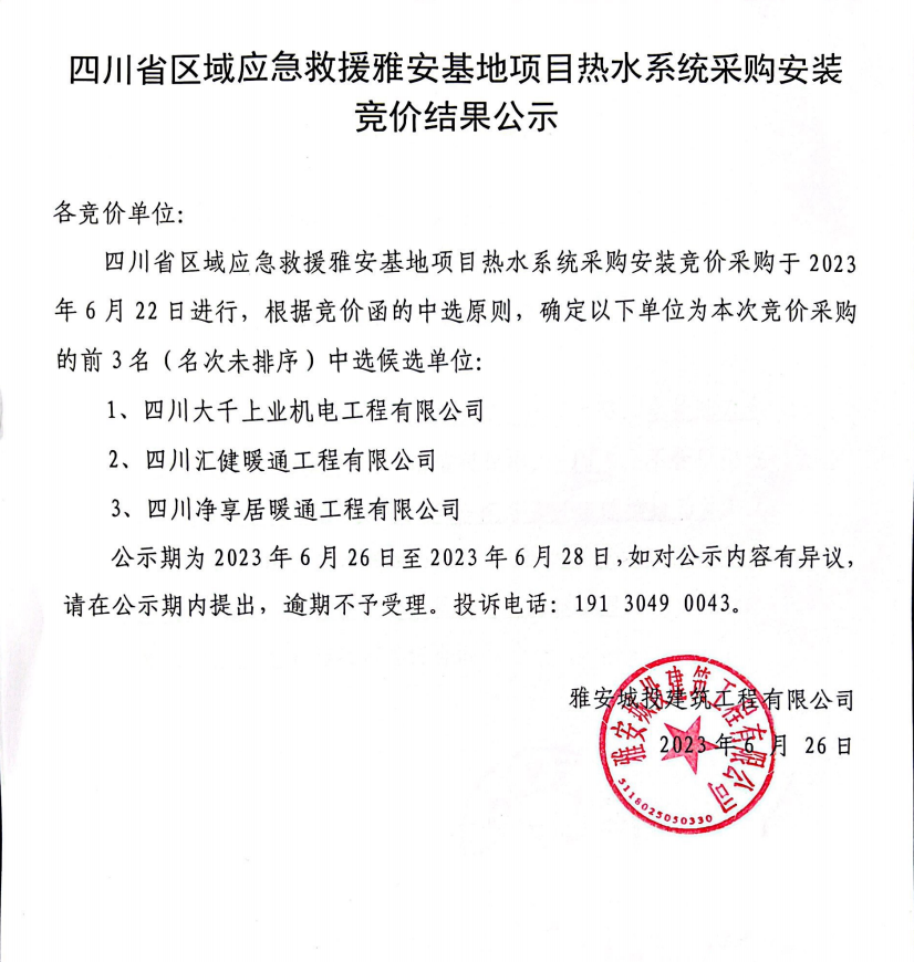 四川省區(qū)域應(yīng)急救援雅安基地項(xiàng)目熱水系統(tǒng)采購(gòu)安裝競(jìng)價(jià)結(jié)果公示