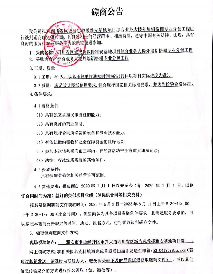 四川省區(qū)域應(yīng)急救援雅安基地項目綜合業(yè)務(wù)大樓外墻鋁格柵專業(yè)分包工程談判磋商公告