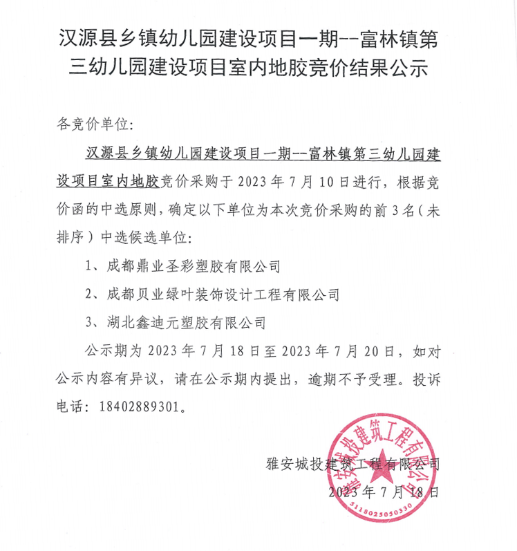 漢源縣鄉(xiāng)鎮(zhèn)幼兒園建設(shè)項目一期--富林鎮(zhèn)第三幼兒園建設(shè)項目室內(nèi)地膠競價結(jié)果公示
