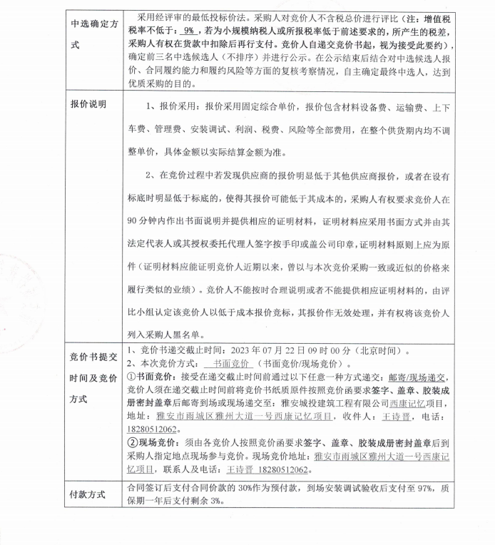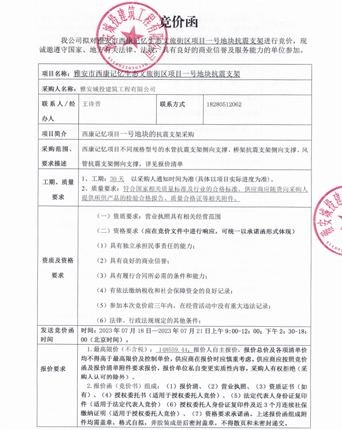 雅安市西康記憶生態(tài)文旅街區(qū)項目一號地塊抗震支架競價采購公告