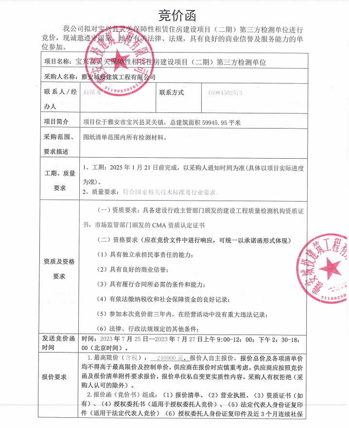寶興縣靈關(guān)保障性租賃住房建設(shè)項(xiàng)目(二期)第三方檢測單位競價公告