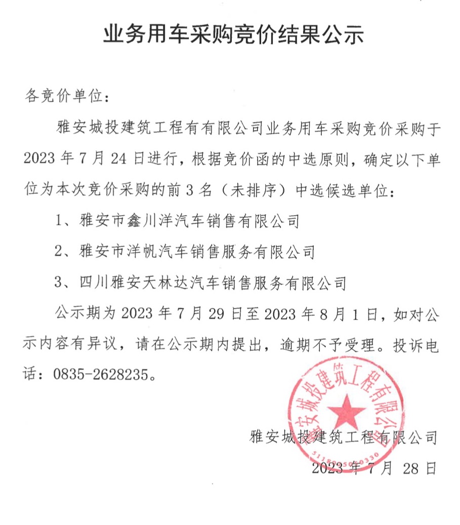 業(yè)務(wù)用車采購競價結(jié)果公示