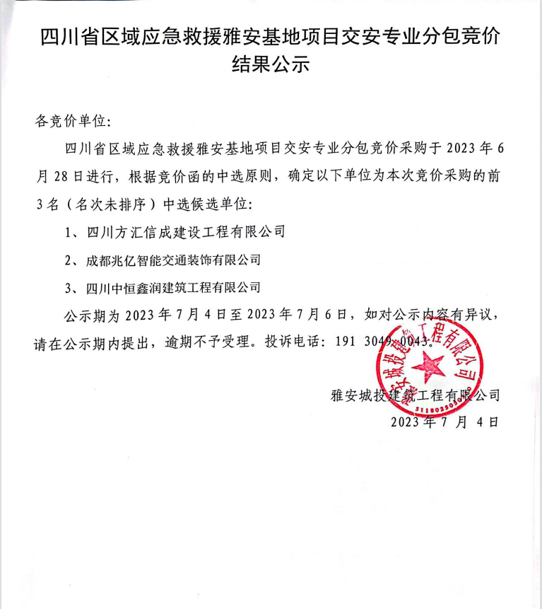 四川省區(qū)域應(yīng)急救援雅安基地項(xiàng)目交安專業(yè)分包競價(jià)結(jié)果公示