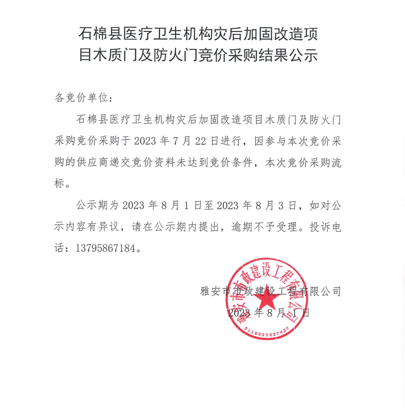 石棉縣醫(yī)療衛(wèi)生機構(gòu)災后加固改造項目木質(zhì)門及防火門競價采購結(jié)果公示