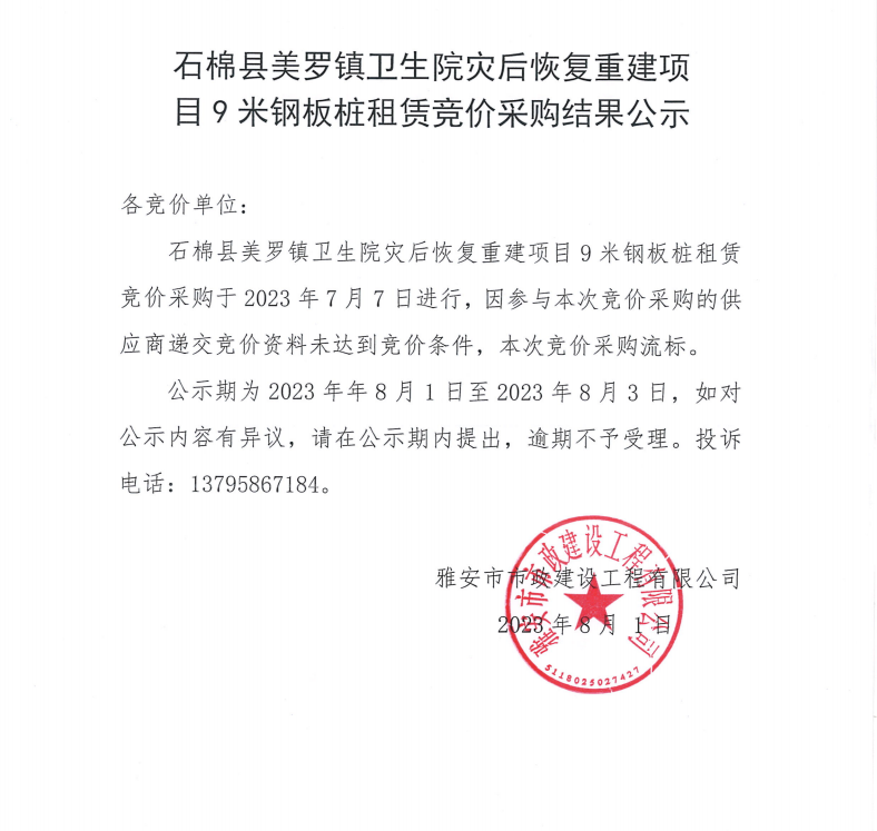 石棉縣美羅鎮(zhèn)衛(wèi)生院災(zāi)后恢復(fù)重建項(xiàng)目9米鋼板樁租賃競(jìng)價(jià)采購(gòu)結(jié)果公示