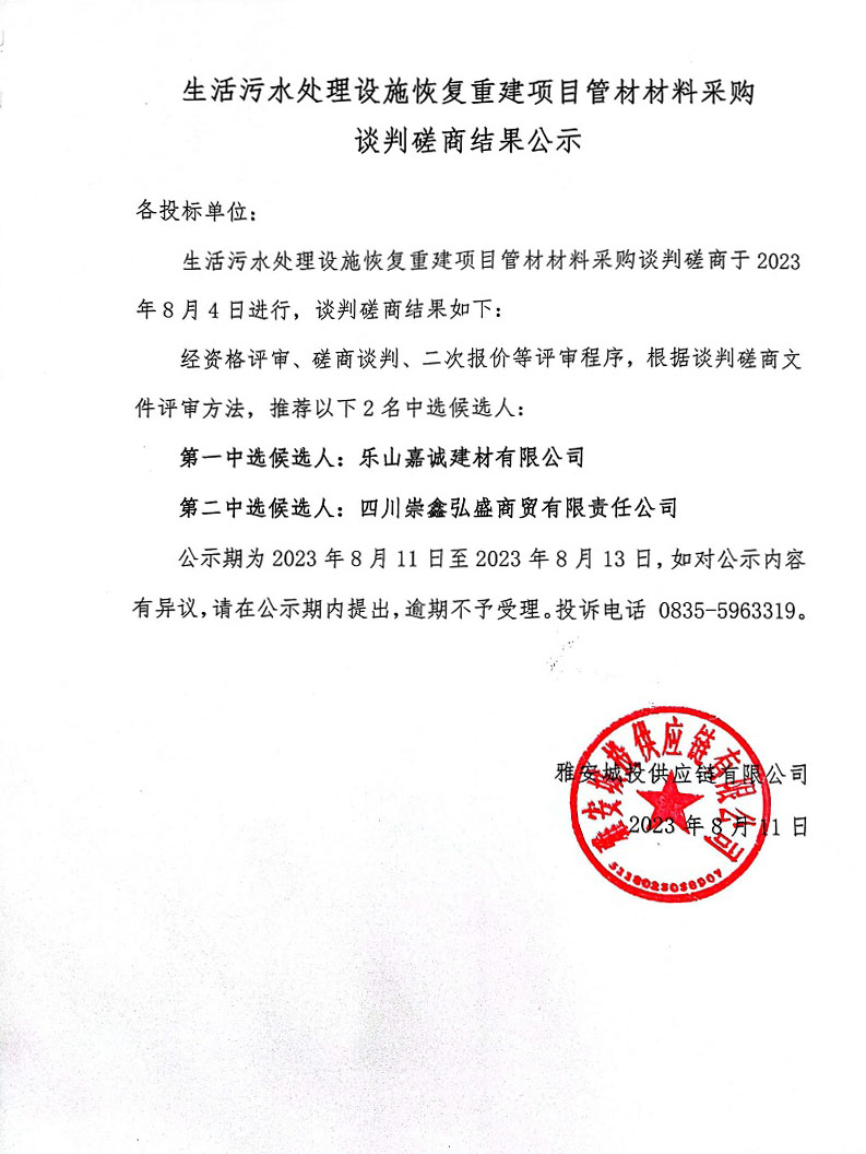 生活污水處理設(shè)施恢復(fù)重建項(xiàng)目管材材料采購談判磋商結(jié)果公示