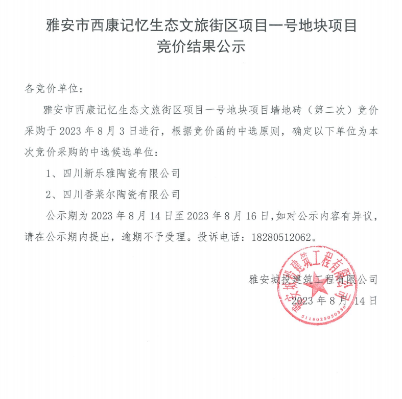 雅安市西康記憶生態(tài)文旅街區(qū)項(xiàng)目一號(hào)地塊項(xiàng)目墻地磚(第二次)競(jìng)價(jià)結(jié)果公示