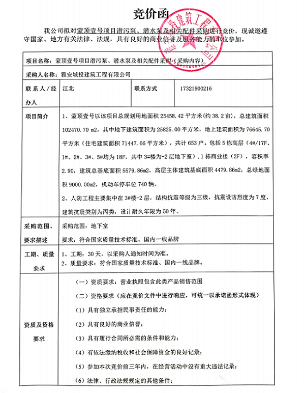 蒙頂壹號(hào)項(xiàng)目潛污泵、潛水泵及相關(guān)配件采購(gòu)競(jìng)價(jià)公告