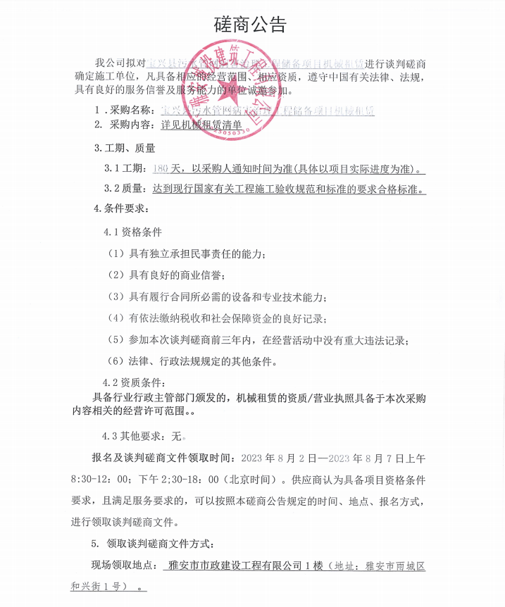 寶興縣污水管網(wǎng)病害治理工程儲備項目機械租賃談判磋商公告
