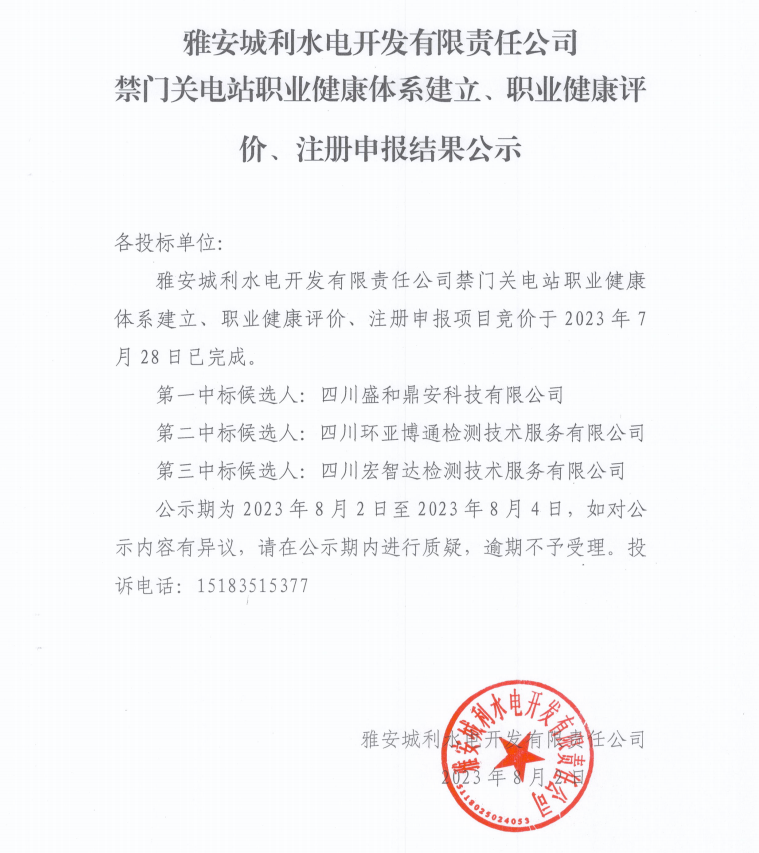 雅安城利水電開發(fā)有限責(zé)任公司禁門關(guān)電站職業(yè)健康體系建立、職業(yè)健康評價、注冊申報結(jié)果公示