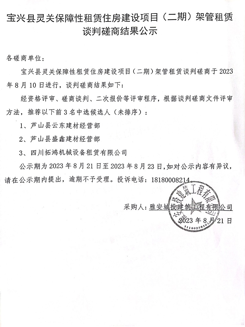寶興縣靈關保障性租賃住房建設項目(二期)架管租賃談判磋商結(jié)果公示
