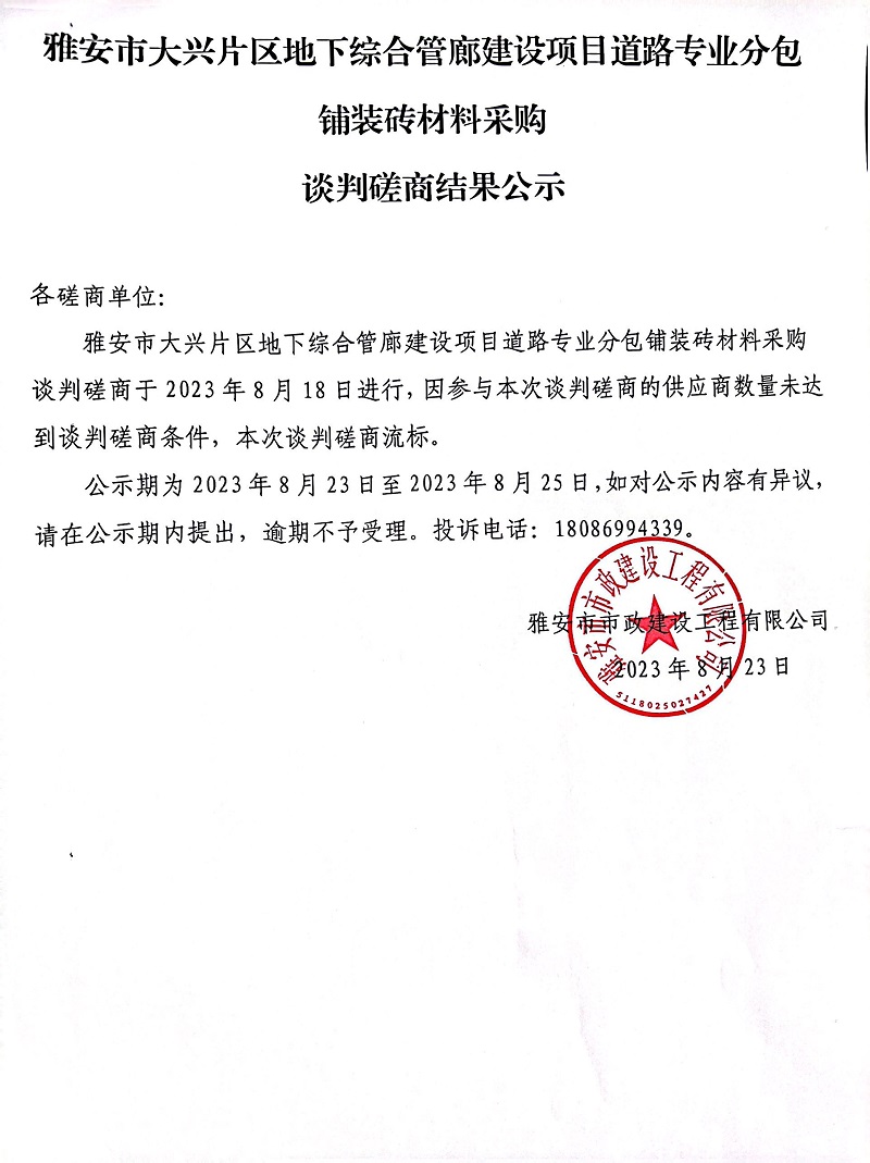 雅安市大興片區(qū)地下綜合管廊建設(shè)項(xiàng)目道路專業(yè)分包鋪裝磚材料采購談判磋商結(jié)果公示