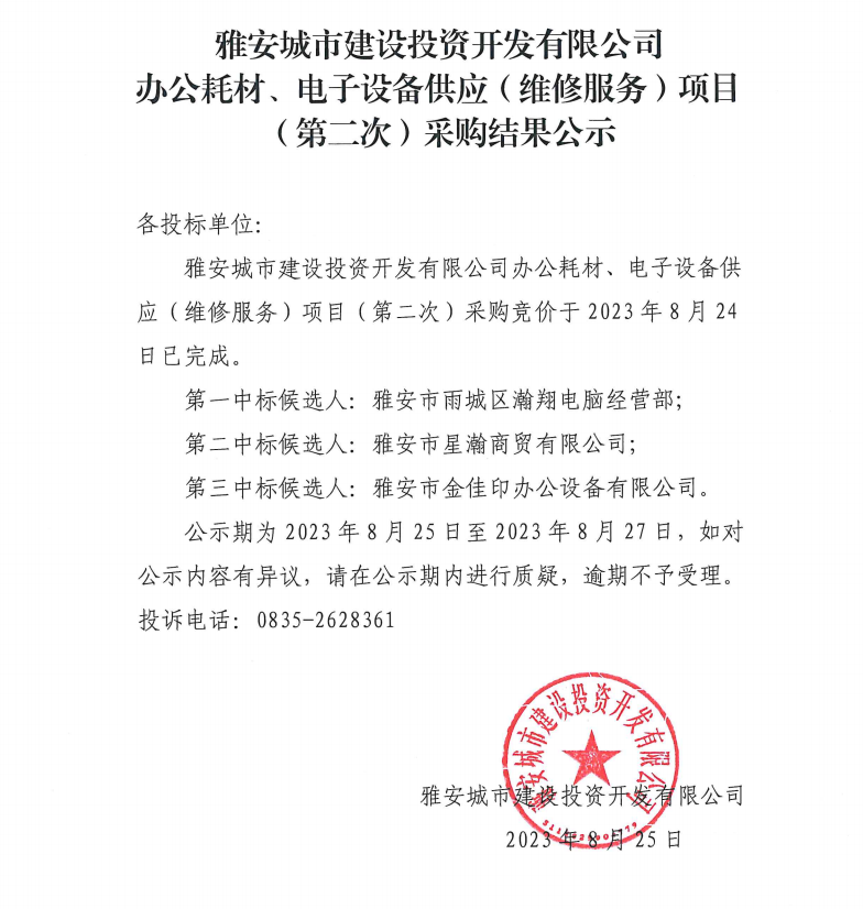 雅安城市建設(shè)投資開發(fā)有限公司辦公耗材、電子設(shè)備供應(維修服務)項目(第二次)采購結(jié)果公示