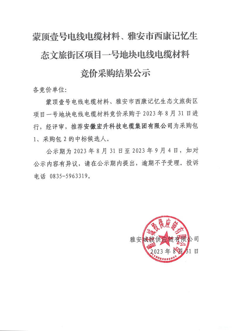 蒙頂壹號電線電纜材料、雅安市西康記憶生態(tài)文旅街區(qū)項目一號地塊電線電纜材料競價采購結(jié)果公示