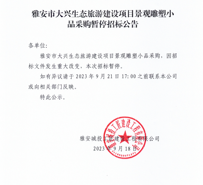 雅安市大興生態(tài)旅游建設(shè)項(xiàng)目景觀雕塑小品采購(gòu)暫停招標(biāo)公告