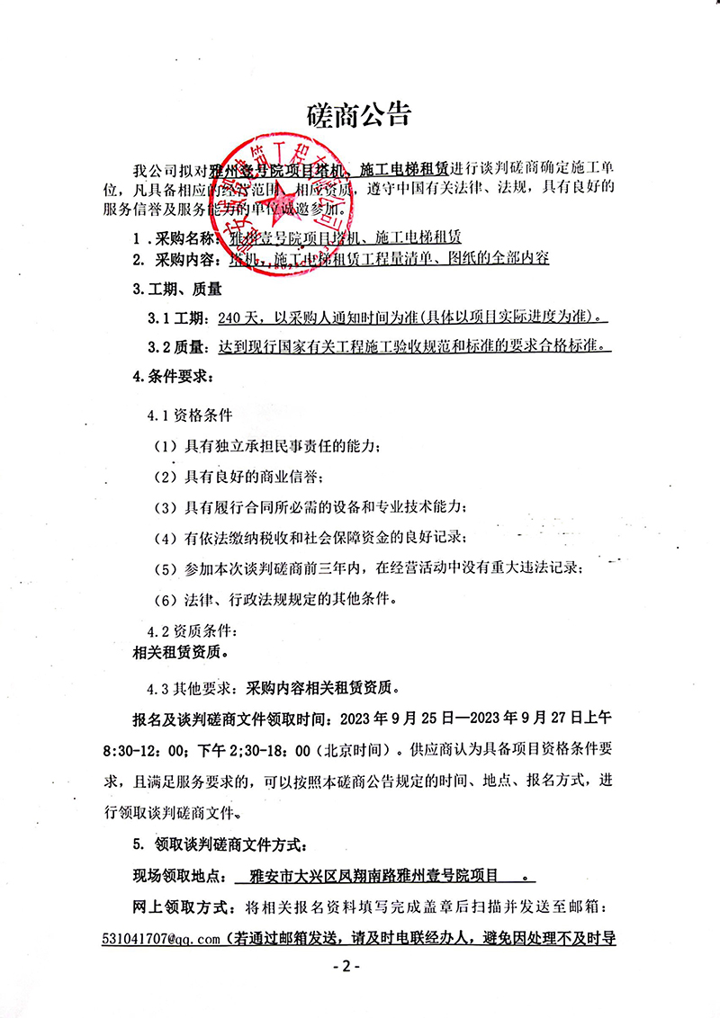 雅州壹號(hào)項(xiàng)目塔機(jī)、施工電梯租賃磋商公告