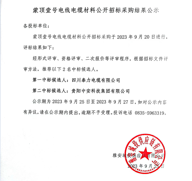 蒙頂壹號電線電纜材料公開招標采購結(jié)果公示