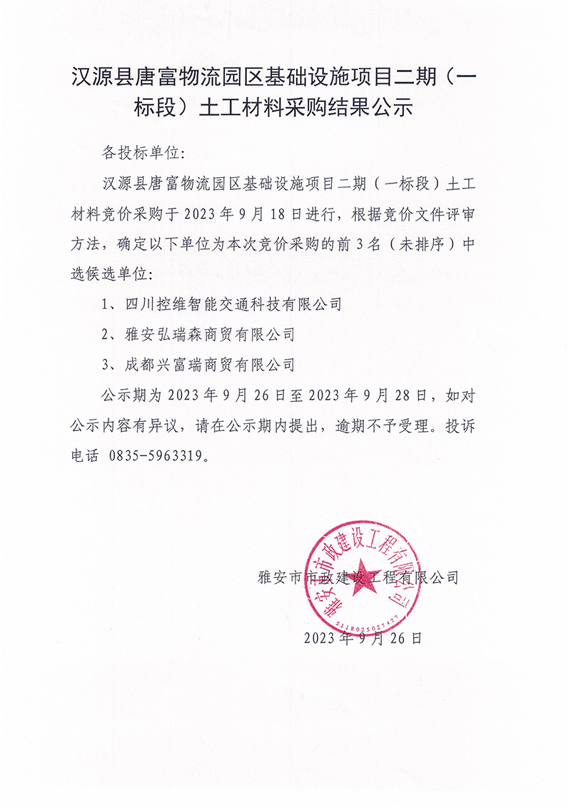漢源縣唐富物流園區(qū)基礎(chǔ)設(shè)施項(xiàng)目二期(一標(biāo)段)土工材料采購結(jié)果公示