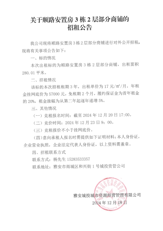 關(guān)于順路安置房3棟2層部分商鋪的招租公告