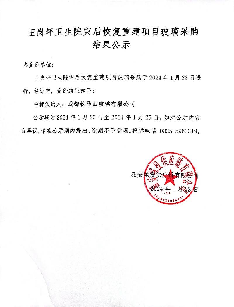 王崗坪衛(wèi)生院災后恢復重建項目玻璃采購結果公示