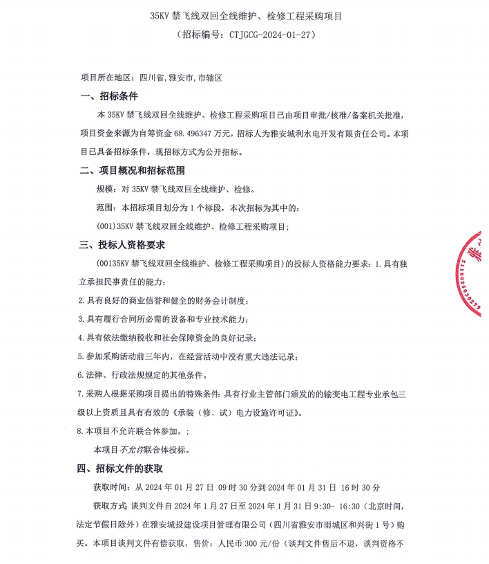 35KV禁飛線雙回全線維護(hù)、檢修工程采購項(xiàng)目公告