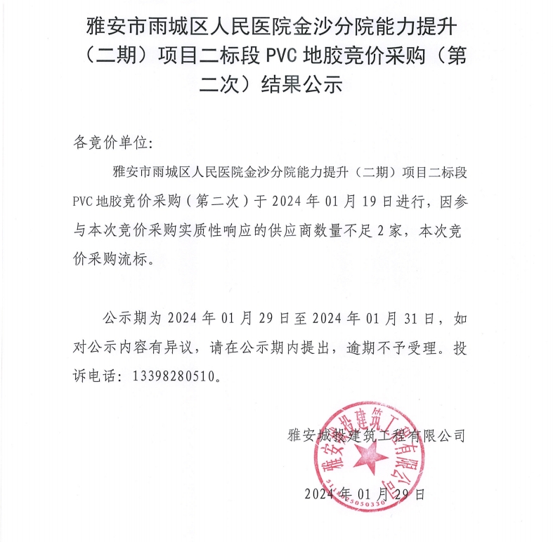 雅安市雨城區(qū)人民醫(yī)院金沙分院能力提升(二期)項目二標段PVC地膠競價采購(第二次)結果公示