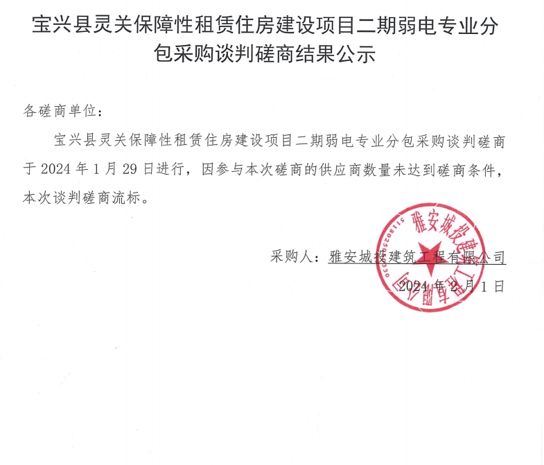 寶興縣靈關(guān)保障性租賃住房建設(shè)項目二期弱電專業(yè)分包采購談判磋商結(jié)果公示