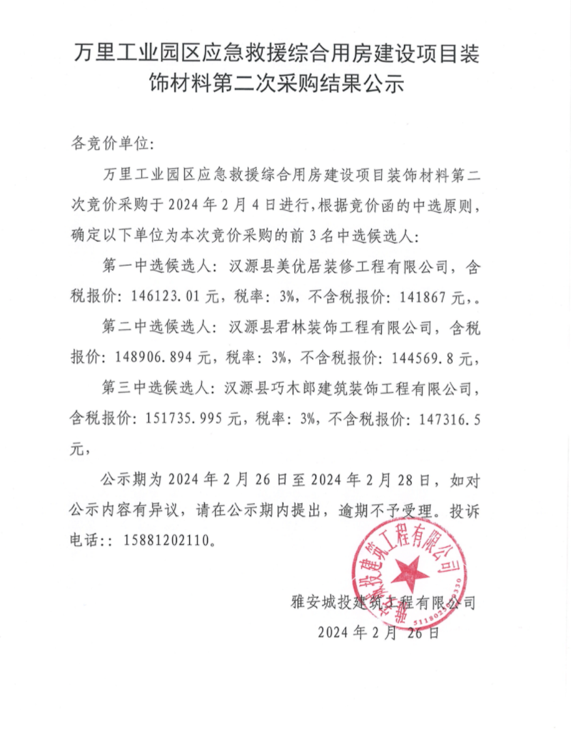 萬里工業(yè)園區(qū)應(yīng)急救援綜合用房建設(shè)項(xiàng)目裝飾材料第二次采購結(jié)果公示