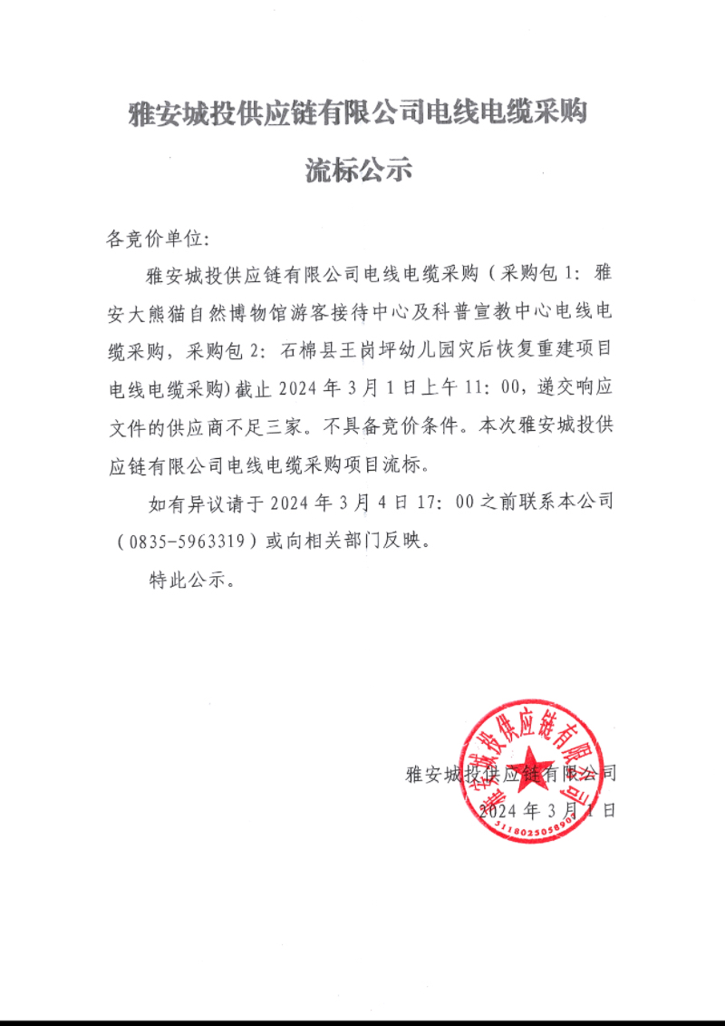 雅安城投供應(yīng)鏈有限公司電線電纜采購(gòu)流標(biāo)公示