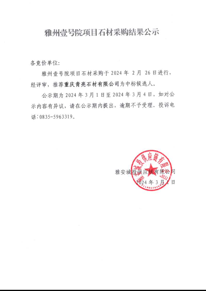 雅州壹號院項目石材采購結果公示