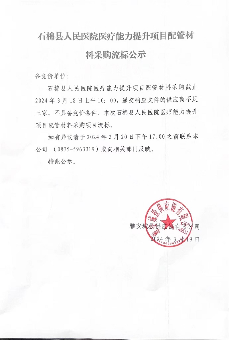 石棉縣人民醫(yī)院醫(yī)療能力提升項目配管材料采購流標(biāo)公示